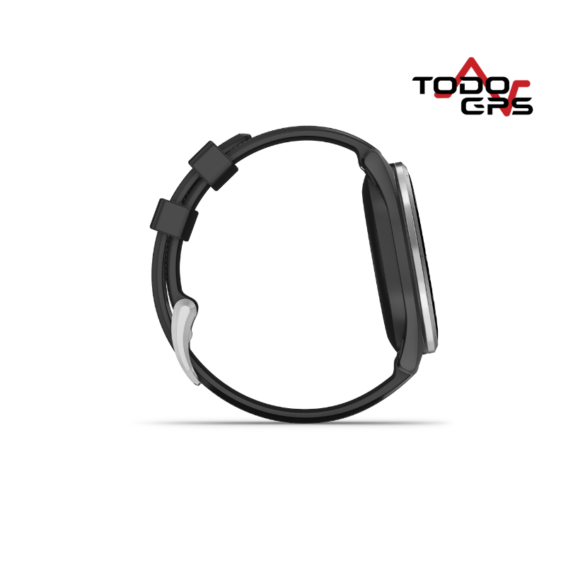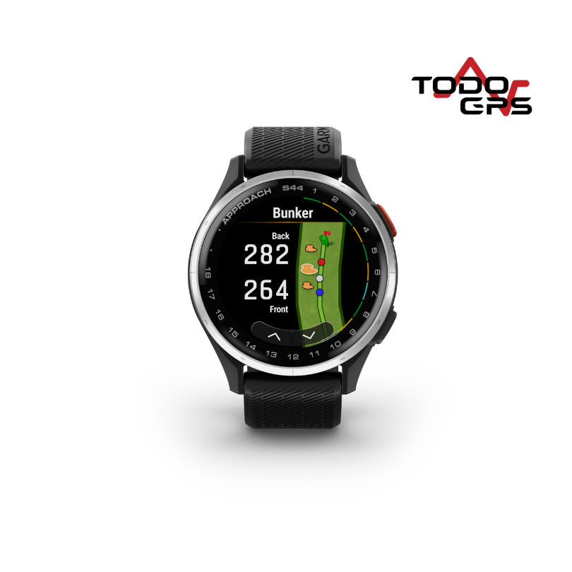 El Approach® S44 de Garmin es un smartwatch diseñado para golfistas que buscan mejorar su juego con tecnología avanzada. Combina un diseño ligero y elegante (bisel de aluminio plateado y correa de silicona negra) con funciones especializadas para ofrecer precisión y comodidad en el campo.
